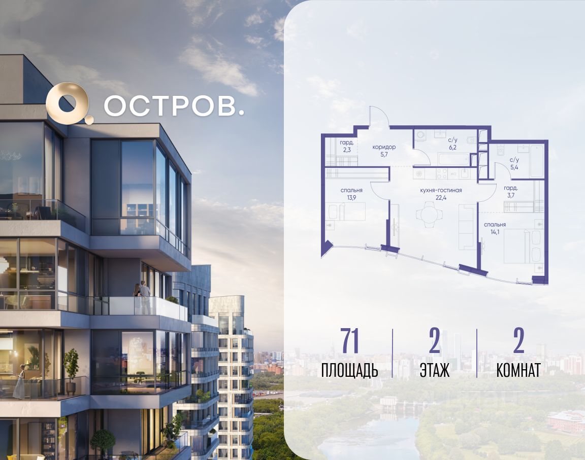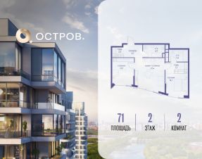 Продаётся 2-комн. квартира от застройщика: общая площадь 71.00 м², жилая м², кухня м², 2-й этаж, жилой квартал "Остров 14", корпус 4 (секция 1). Срок сдачи: 2 квартал 2029 года.