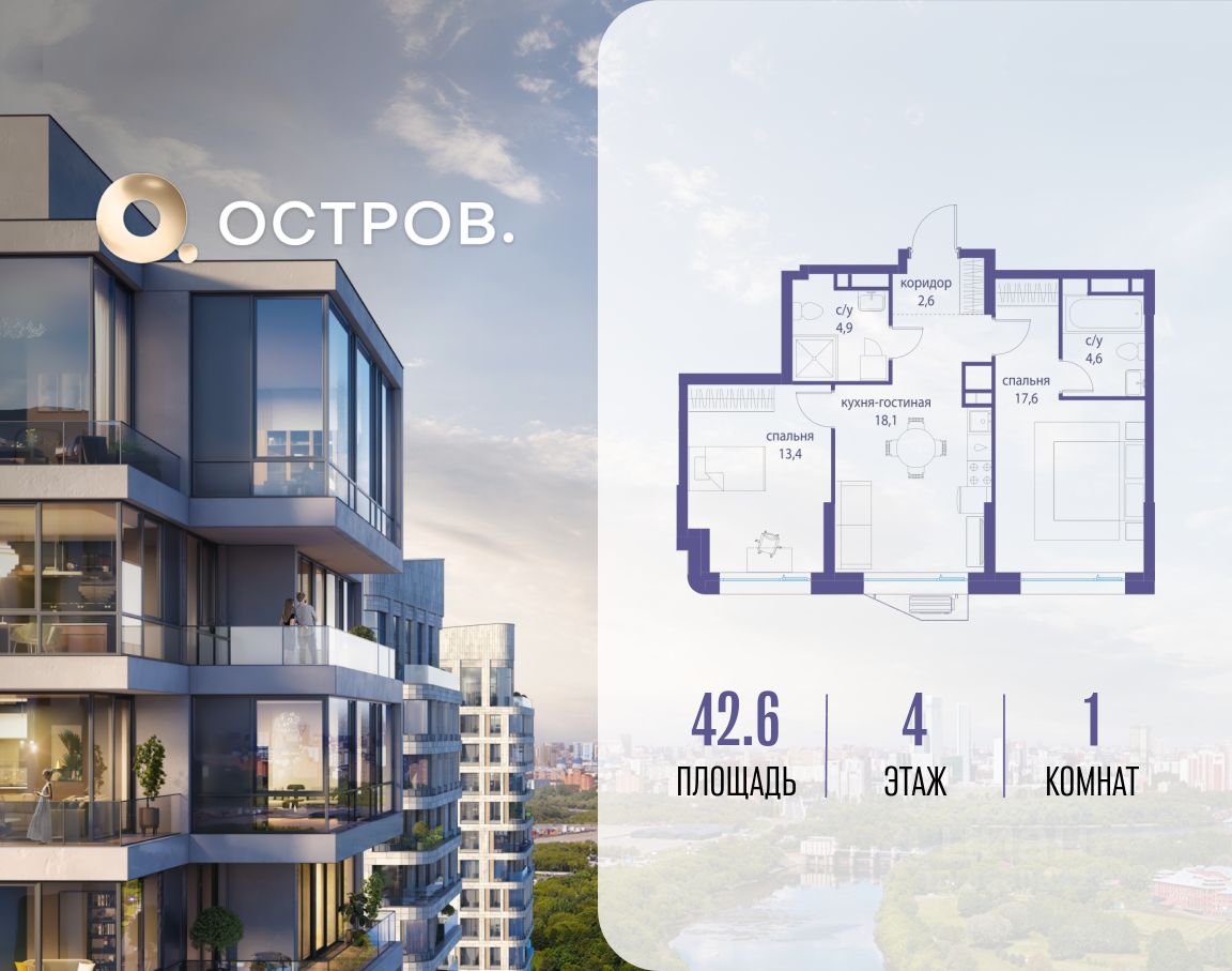 Продаётся 1-комн. квартира от застройщика: общая площадь 42.60 м², жилая м², кухня м², 4-й этаж, жилой квартал "Остров 14", корпус 4 (секция 1). Срок сдачи: 2 квартал 2029 года.