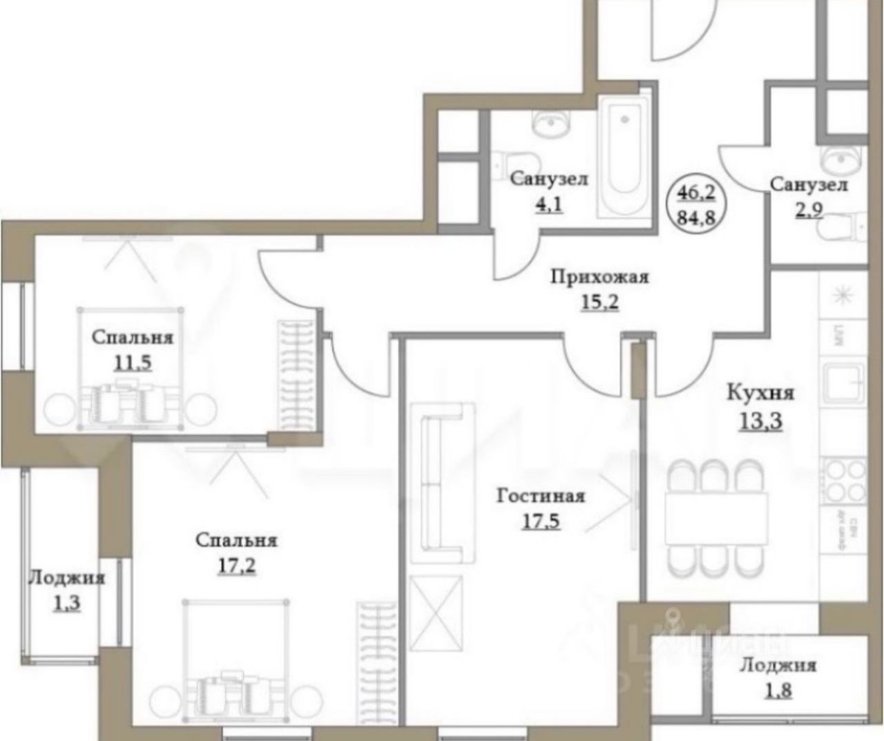 Общая площадь 85м2. Две лоджии и два сан.узла. Самая востребованная планировка в ЖК с возможностью перепланировки по своему усмотрению.