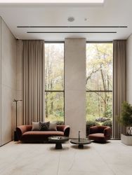 Лобби проекта наполнено светом и спокойствием - здесь хочется ненадолго задержаться, перевести дыхание. Мягкое освещение создают авторские светильники: они подчеркивают архитектуру пространства и не утомляют глаз. Акцентный элемент - мозаичное панно с растительным мотивом, выполненное из керамических пластин, которое придает интерьеру изысканность и художественную выразительность."