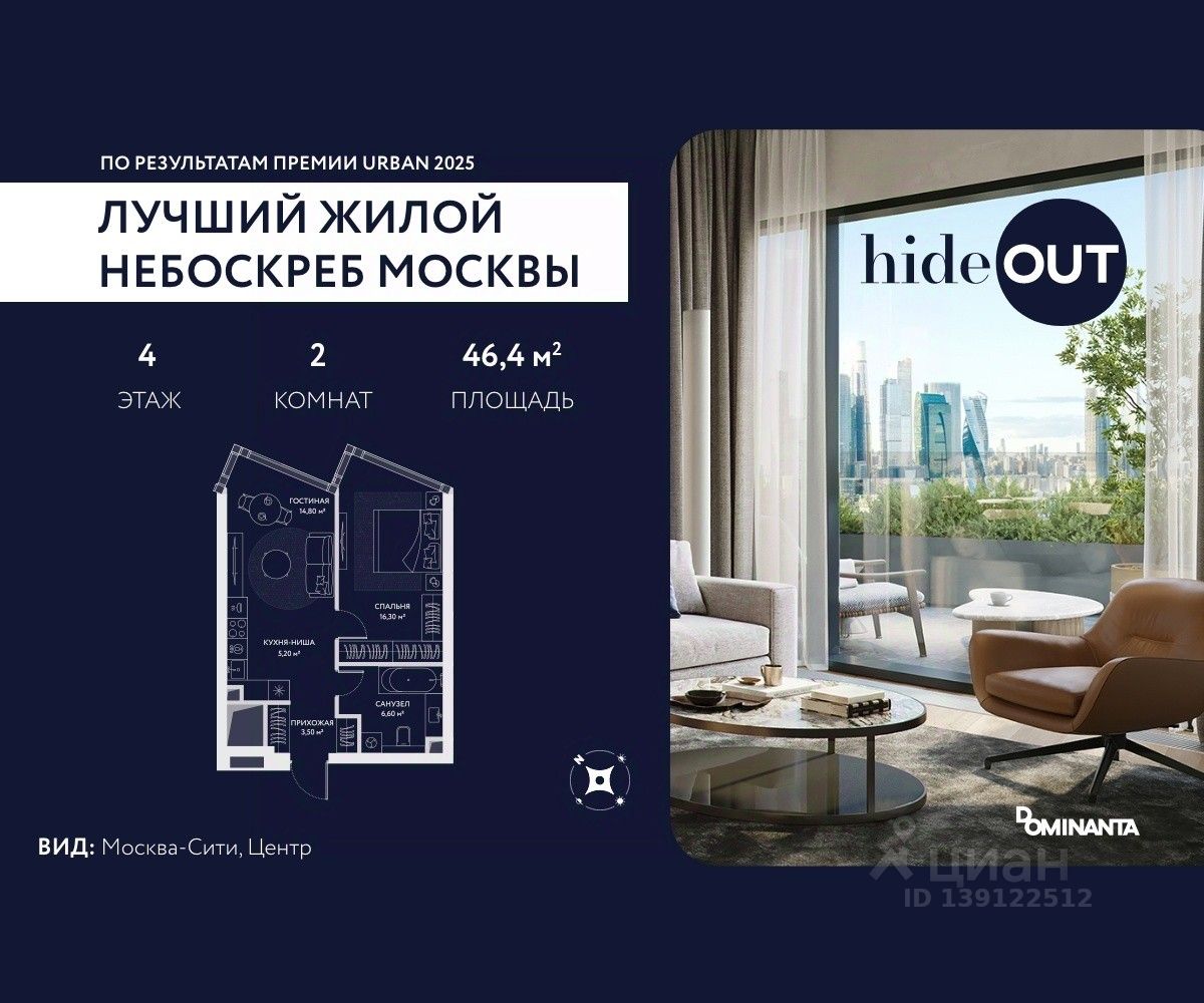 Прямая продажа от застройщика. Продается 2-комнатная квартира площадью 46.4 кв.м. на 6-м этаже 34-этажного дома в ЖК hideOUT с панорамными видами: Во двор. Высота потолков 3,25 м. hideOUT — премиальный проект компании Dominanta. Это новый уровень жизни и комфорта без компромиссов. Две башни — 34 и 49 этажей — открывают захватывающие виды на Москву. Архитектурной доминантой проекта становится мост, соединяющий башни на высоте 80 метров. Закрытая территория, охрана 24/7, зона экстренной безопасности на подземном уровне, система пожаротушения. На мосту между башнями на 22-м этаже находится SocialHUB — предусмотрено 16 комфортных пространств для работы, отдыха и развлечений с панорамными видами и клубным форматом доступа. Концепция благоустройства hideOUT — баланс между природой и технологичным городом будущего. На территории сада предусмотрены 15 зон для отдыха, работы, спорта и детей. Знаковым местом станет центральная площадь с амфитеатром и водопадом — сочетание камней, растений и струящейся воды создает идеальный баланс с природой. В проекте действуют привлекательные условия покупки: - скидка до 20% при 100% оплате стоимости лота и ипотеке без субсидирования. Предложение действует до 28.02.2026. - рассрочка 0% на 12 месяцев с первоначальным взносом 30% / на 18 месяцев с первоначальным взносом 50%. Застройщик АО "СЗ "ХАЙДАУТ", ИНН 7729058636, ОГРН 1027739319420. Проектная декларация на сайте наш.дом.рф. Предложение не является публичной офертой.