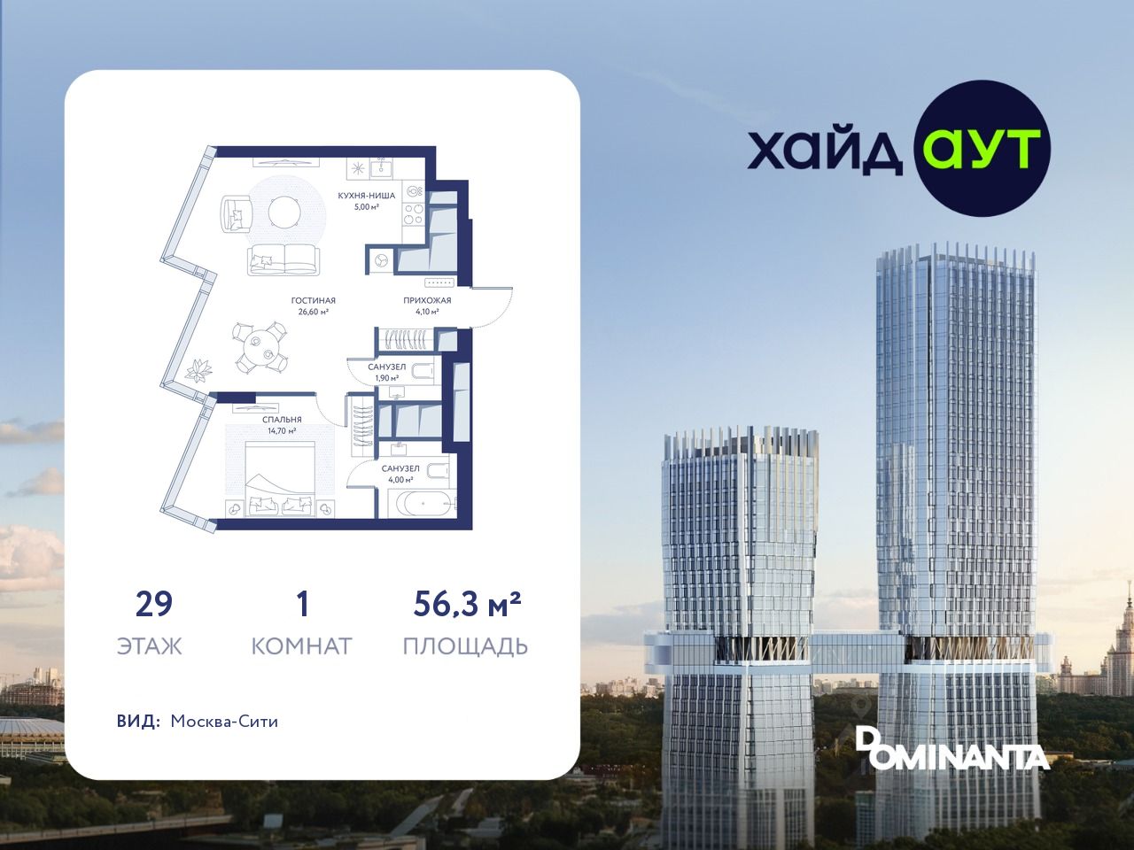 ХАЙДАУТ — премиальный проект компании Dominanta. Это новый уровень жизни и комфорта без компромиссов. Две башни — 34 и 49 этажей — открывают захватывающие виды на Москву. Архитектурной доминантой проекта становится мост, соединяющий башни на высоте 80 метров.