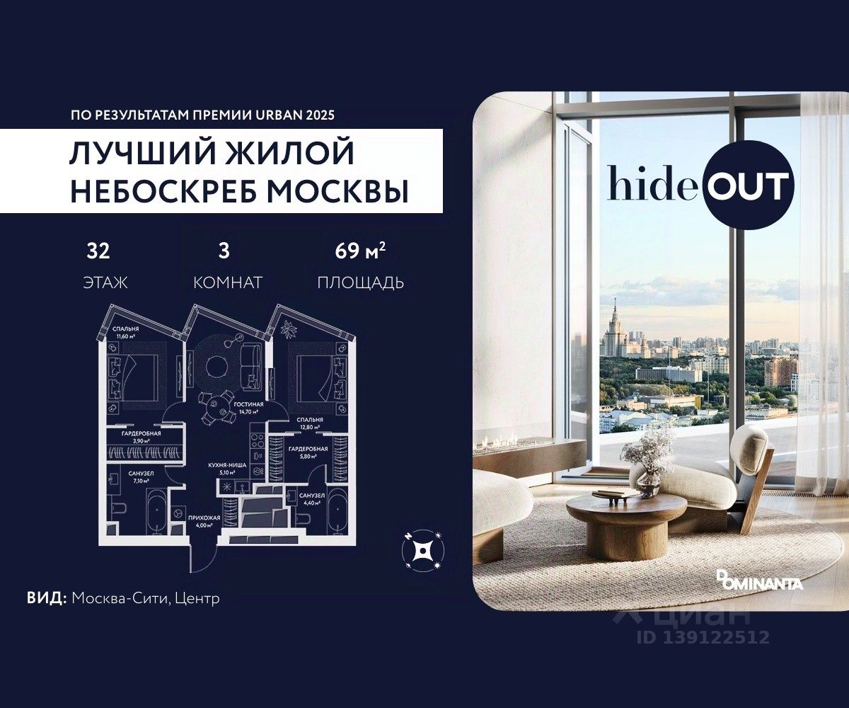 Прямая продажа от застройщика. Продается 3-комнатная квартира площадью 69 кв.м. на 4-м этаже 34-этажного дома в ЖК hideOUT с панорамными видами: Центр. Высота потолков 3,25 м. hideOUT — премиальный проект компании Dominanta. Это новый уровень жизни и комфорта без компромиссов. Две башни — 34 и 49 этажей — открывают захватывающие виды на Москву. Архитектурной доминантой проекта становится мост, соединяющий башни на высоте 80 метров. Закрытая территория, охрана 24/7, зона экстренной безопасности на подземном уровне, система пожаротушения. На мосту между башнями на 22-м этаже находится SocialHUB — предусмотрено 16 комфортных пространств для работы, отдыха и развлечений с панорамными видами и клубным форматом доступа. Концепция благоустройства hideOUT — баланс между природой и технологичным городом будущего. На территории сада предусмотрены 15 зон для отдыха, работы, спорта и детей. Знаковым местом станет центральная площадь с амфитеатром и водопадом — сочетание камней, растений и струящейся воды создает идеальный баланс с природой. В проекте действуют привлекательные условия покупки: - скидка до 20% при 100% оплате стоимости лота и ипотеке без субсидирования. Предложение действует до 28.02.2026. - рассрочка 0% на 12 месяцев с первоначальным взносом 30% / на 18 месяцев с первоначальным взносом 50%. Застройщик АО "СЗ "ХАЙДАУТ", ИНН 7729058636, ОГРН 1027739319420. Проектная декларация на сайте наш.дом.рф. Предложение не является публичной офертой.