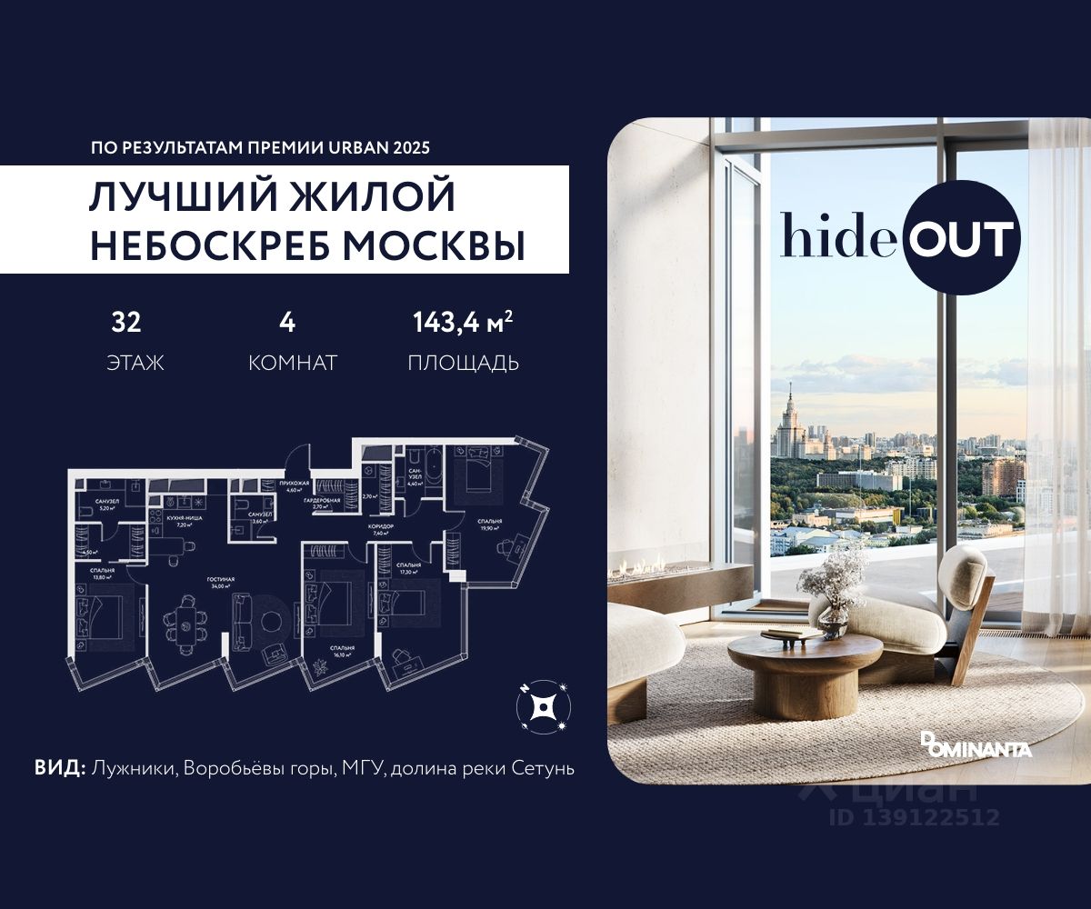 Прямая продажа от застройщика. Продается 5-комнатная квартира площадью 143.4 кв.м. на 6-м этаже 34-этажного дома в ЖК hideOUT с панорамными видами: Лужники, Воробьёвы горы, МГУ, долина реки Сетунь. Высота потолков 3,25 м. hideOUT — премиальный проект компании Dominanta. Это новый уровень жизни и комфорта без компромиссов. Две башни — 34 и 49 этажей — открывают захватывающие виды на Москву. Архитектурной доминантой проекта становится мост, соединяющий башни на высоте 80 метров. Закрытая территория, охрана 24/7, зона экстренной безопасности на подземном уровне, система пожаротушения. На мосту между башнями на 22-м этаже находится SocialHUB — предусмотрено 16 комфортных пространств для работы, отдыха и развлечений с панорамными видами и клубным форматом доступа. Концепция благоустройства hideOUT — баланс между природой и технологичным городом будущего. На территории сада предусмотрены 15 зон для отдыха, работы, спорта и детей. Знаковым местом станет центральная площадь с амфитеатром и водопадом — сочетание камней, растений и струящейся воды создает идеальный баланс с природой. В проекте действуют привлекательные условия покупки: - скидка до 20% при 100% оплате стоимости лота и ипотеке без субсидирования. Предложение действует до 28.02.2026. - рассрочка 0% на 12 месяцев с первоначальным взносом 30% / на 18 месяцев с первоначальным взносом 50%. Застройщик АО "СЗ "ХАЙДАУТ", ИНН 7729058636, ОГРН 1027739319420. Проектная декларация на сайте наш.дом.рф. Предложение не является публичной офертой.