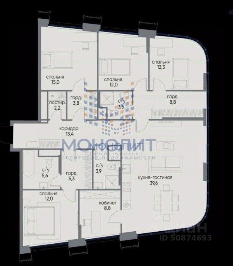 Функциональная планировка: кухня-гостиная 39,6 м², 4 спальни, кабинет, 3 санузла, гардеробные и постирочная. Окна на одну сторону обеспечивают отличную инсоляцию и ощущение воздуха. Квартира идеально подойдёт для семьи, ценящей пространство и приватность.