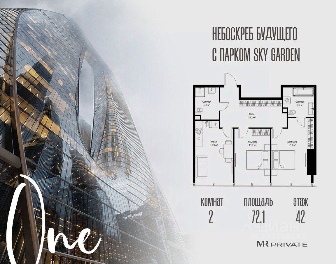 В продаже 2-комнатная квартира площадью 72.10 м² на 42-м этаже.