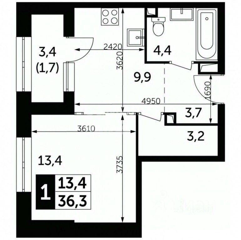 Общая площадь: 36,3 м².