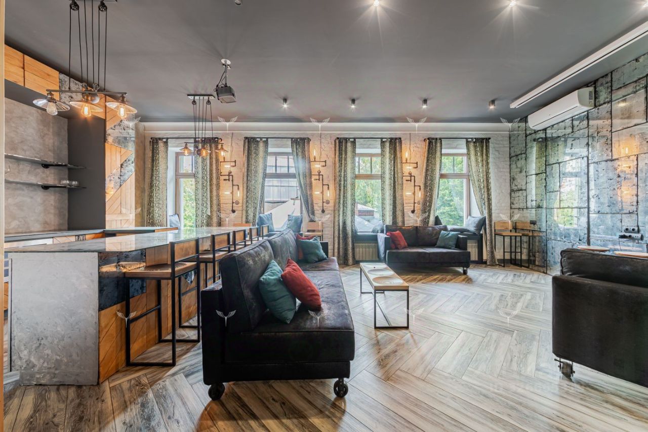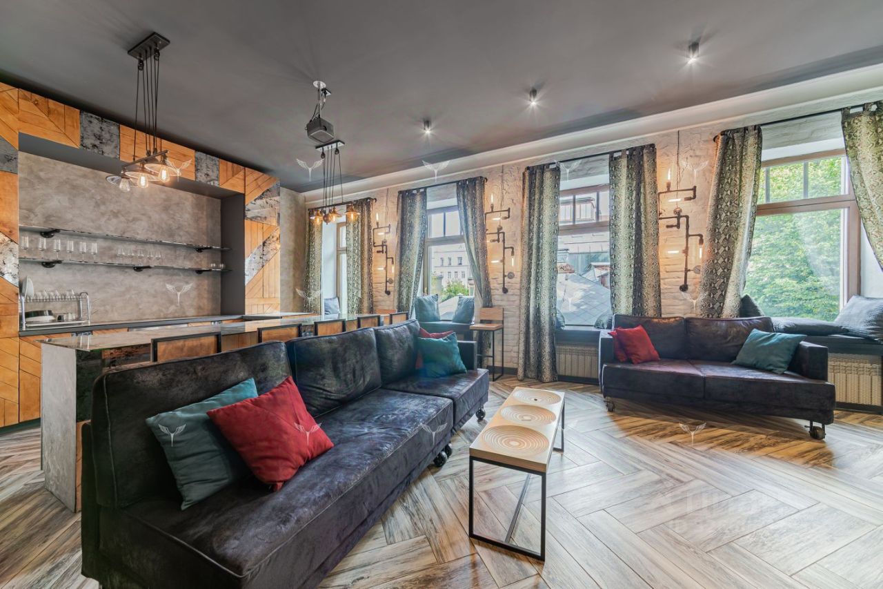Большое количество окон в гостиной, высокие потолки - наполняют квартиру светом и пространством.