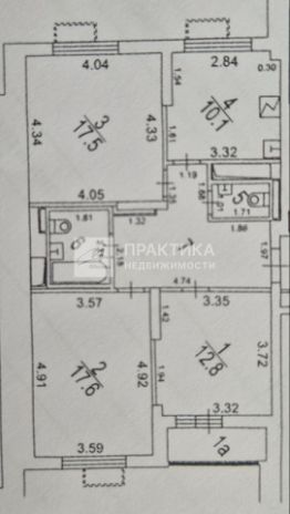 Общая площадь квартиры составляет 75,45 кв.м., три изолированные комнаты площадью 17,6 кв. м, 17,5 кв. м и 12,8 кв. м, кухня 10,1 кв. м.