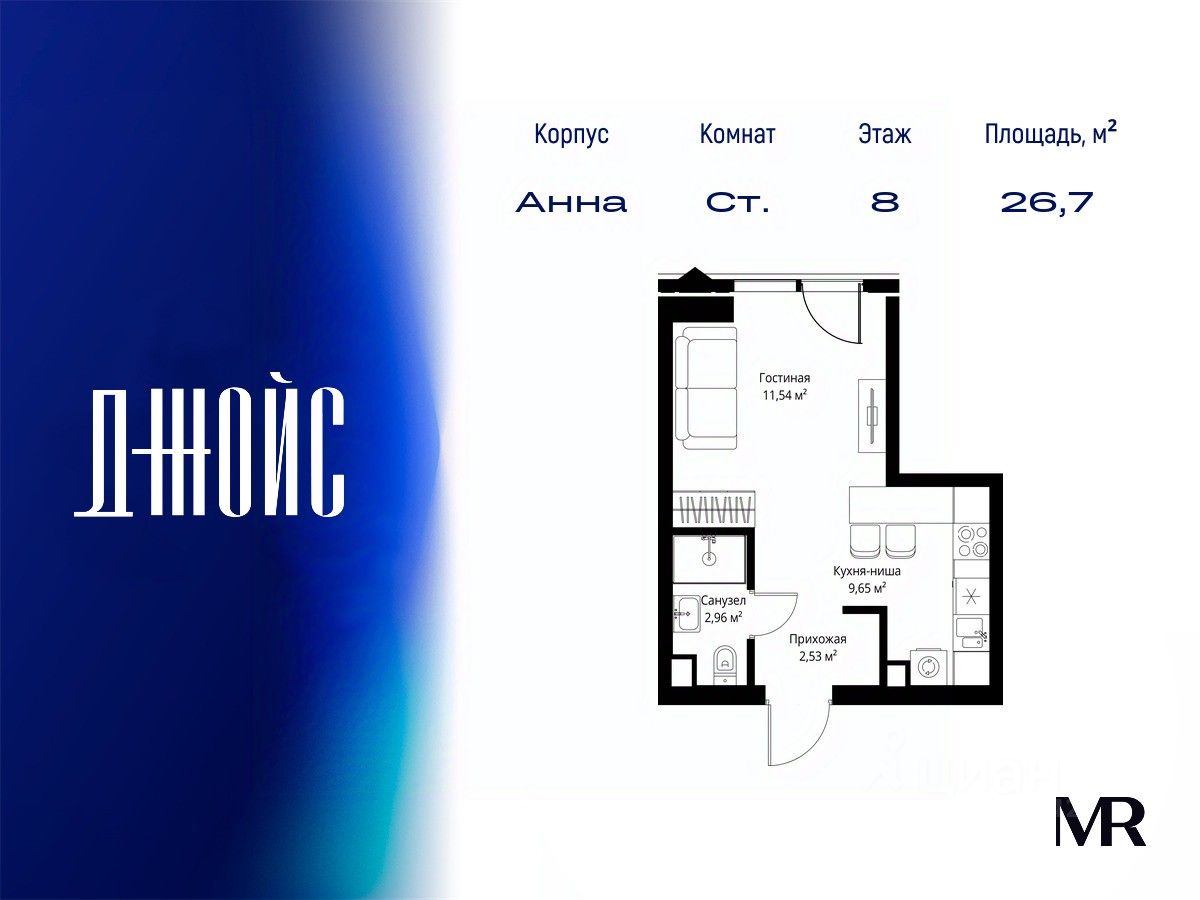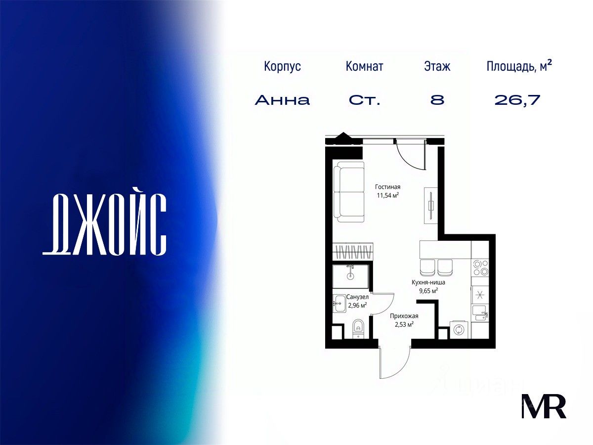 В продаже квартира площадью 26.68 м² с предчистовой отделкой на 8 этаже 55 этажного дома. Квартира расположена в корпусе Анна.