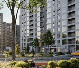 Современный монолитный корпус высотой 16 этажей выполнен в мягкой гамме природных оттенков — бежевом и сером. Кирпичная текстура фасадов, витражное остекление и навесная система придают дому сдержанный, благородный вид.
