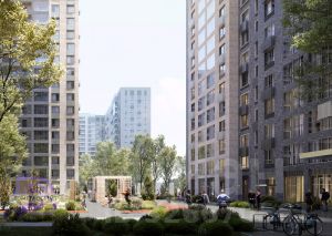 Закрытый двор без машин оформлен в естественной зеленой палитре с детскими и спортивными площадками, зонами отдыха и территорией для выгула собак.