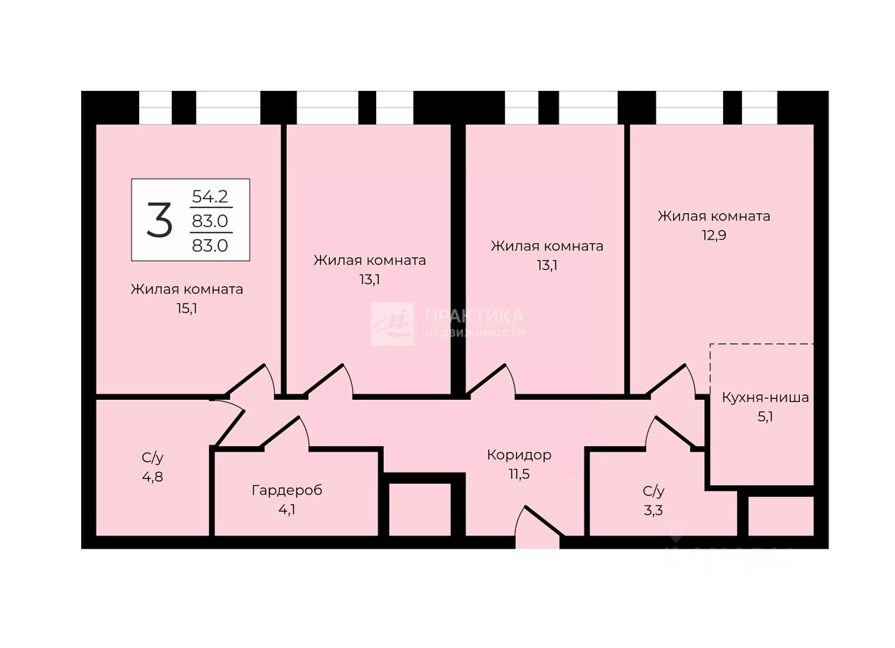 - изолированные комнаты (15,1/13,1/13,1/12,9 кв.м.);