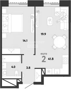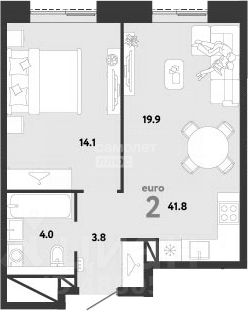 Планировка: изолированная комната (14,1 кв.м. ), кухня-гостинная (19,8 кв.м.), холл (3,8 кв.м.) и санузел (4,0 кв.м.).