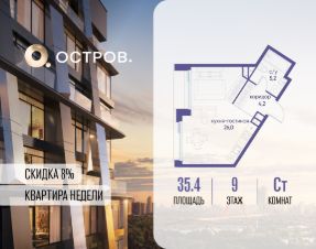 Продаётся студия от застройщика: общая площадь 35.40 м², жилая 20.00 м², кухня 6.00 м², 9, жилой квартал "Остров 12", корпус 1 (12.1 квартал) (секция 1). срок сдачи: 4-кв. 2025.