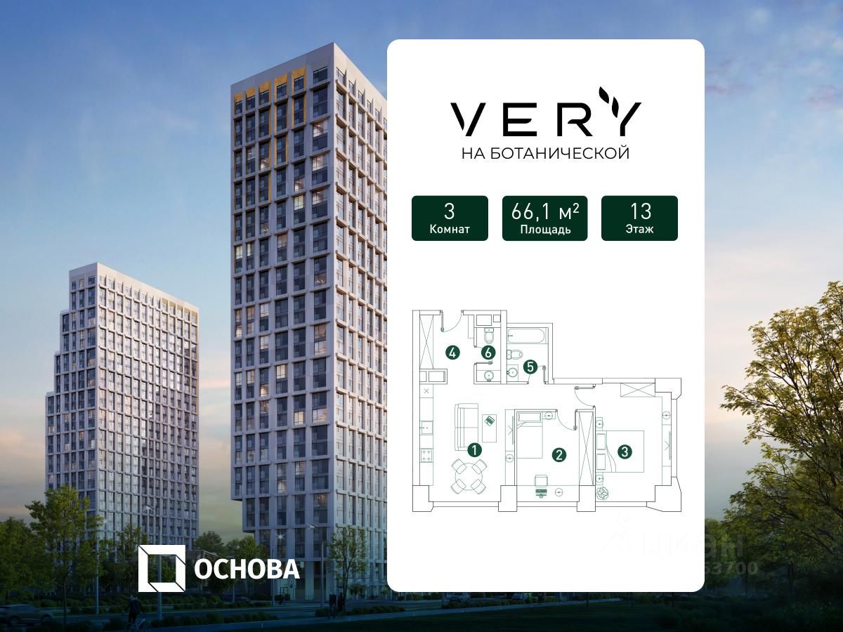 Продается 3-к квартира площадью 66.1 кв.м. на 13-м этаже 29 этажного дома в ЖК "Very" от ГК ОСНОВА.