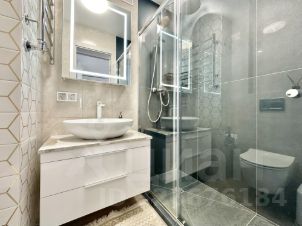 Роскошная ванная комната, отделанная дизайнерской плиткой. Центр притяжения — просторная душевая кабина с качественной сантехникой.