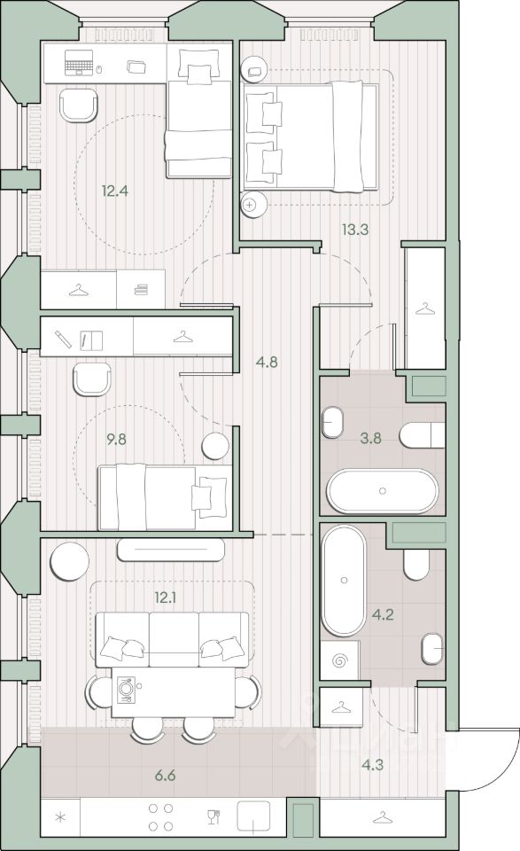 Продаётся 3-комнатная квартира общей площадью 71.3 кв.м. с отделкой white box. Квартира расположена на 9 этаже корпуса 5.2 в жилом комплексе бизнес-класса "Среда на Лобачевского" в пешей доступности от метро "Аминьевская".
