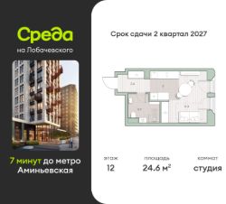 Продаётся студия общей площадью 24.6 кв.м. с отделкой white box. Квартира расположена на 12 этаже корпуса 5.2 в жилом комплексе бизнес-класса "Среда на Лобачевского" в пешей доступности от метро "Аминьевская".