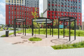 Дома высотой до 22 этажей построены по монолитной технологии. Рисунок на фасадах отсылает к традиционному искусству Староселья — плетению кружев из стекляруса.