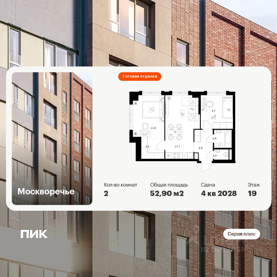 Продаётся 2-комн. квартира площадью 52,9 кв.м на 12 этаже 29 этажного дома (Корпус 2.1, Секция 1) проекта ПИК Москворечье. Светлый просторный подъезд на уровне земли, функциональная планировка, большие окна, c отделкой.