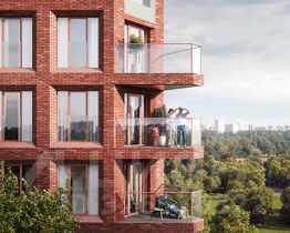 Лобби выполнены в стиле современного минимализма. В отделке использованы долговечные материалы с выразительной фактурой: кирпич сочетается с мраморным бесшовным полом из наливного материала терраццо, гладкой плиткой и стеклом. Для автовладельцев будет доступен подземный паркинг.