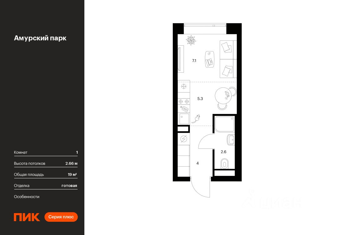 Продаётся квартира-студия площадью 19 кв.м на 8 этаже 27 этажного дома (Корпус 4.5, Секция 6) проекта ПИК Амурский парк. Светлый просторный подъезд на уровне земли, функциональная планировка, большие окна, c отделкой.