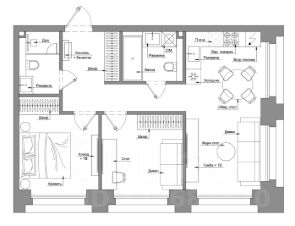 Планировка (на картинках сгенерирован вариант мебелеровки + подготовлено предварительное планировочное решение с расстановкой мебели и оборудования):