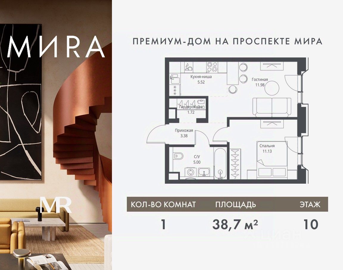 Продаётся 1-комнатная квартира общей площадью 38.73 м² без отделки в доме премиум-класса МИRА на 10-м этаже 23 этажного дома. Квартира расположена в корпусе 2.