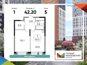 Общая площадь квартиры - 42,2 кв. м, этаж 5 из 22.