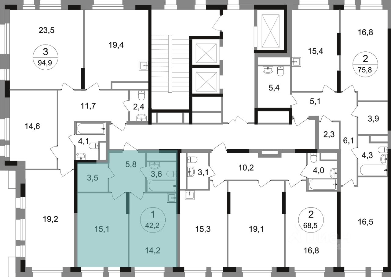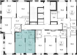 Общая площадь квартиры - 42,2 кв. м, этаж 11 из 22.