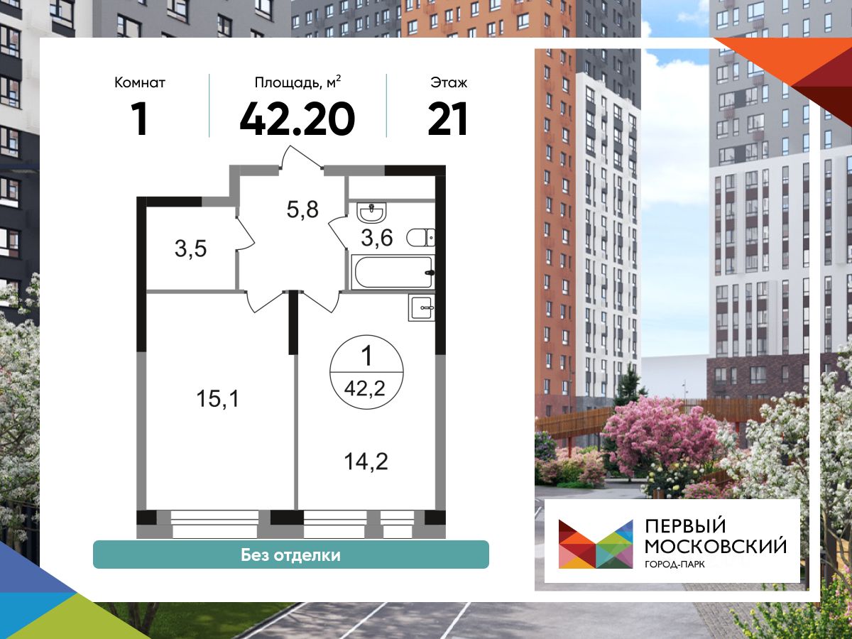 Общая площадь квартиры - 42,2 кв. м, этаж 21 из 22.