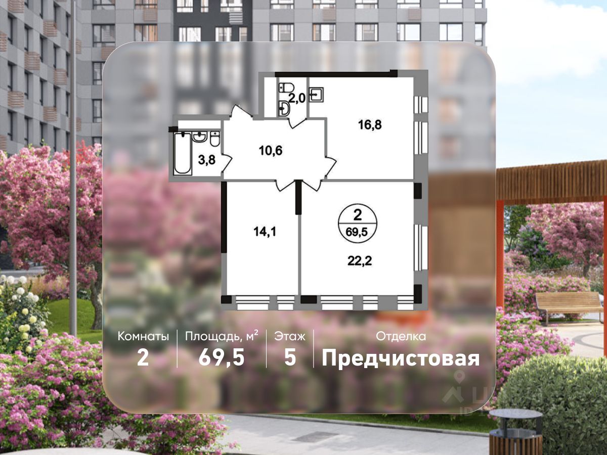 Общая площадь квартиры - 69,5 кв. м, этаж 5 из 22.