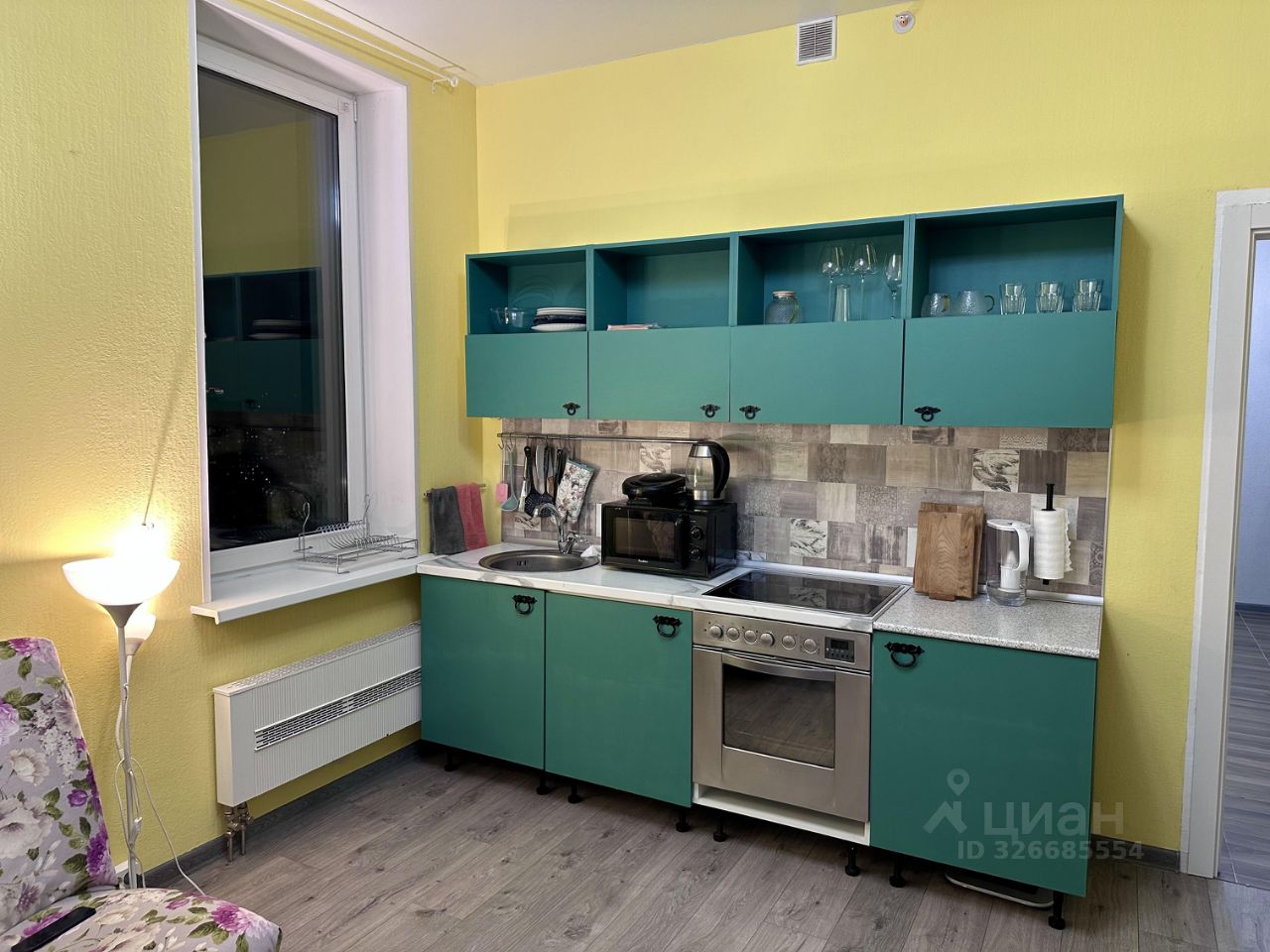 Видовая апартаменты-студия в современном жилом комплексе, расположенном на 19 этаже 21-этажного монолитного дома, построенного в 2020 году. Общая площадь квартиры составляет 35 кв. м, из которых 20 кв. м отведено под жилую зону и 6 кв. м под кухню. Высота потолков — 2.9 метра, что создает ощущение простора и света.
