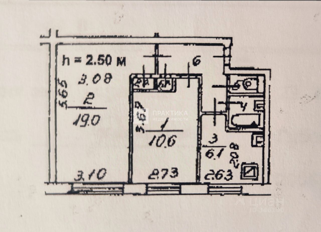 Общая площадь квартиры: 44,8 кв.м.. Две изолированные комнаты: 19,0 кв.м и 10,6 кв.м. Кухня: 6,1 кв.м. Балкона нет. Высота потолков - 2,50. Лифт один - пассажирский.