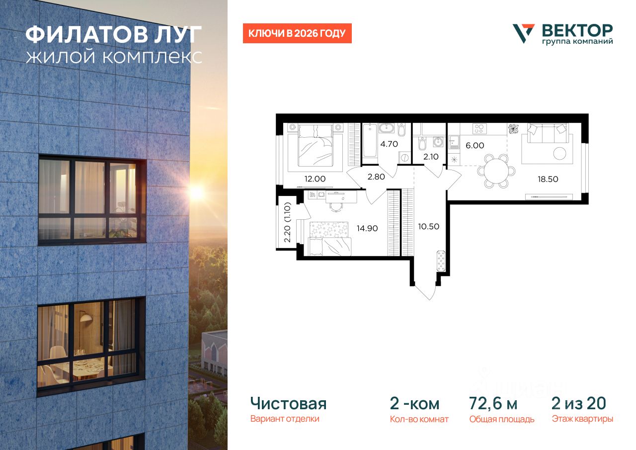 Продается 2-комн. квартира площадью 72,6 кв.м на 2 этаже 20 этажного дома в ЖК "Филатов Луг" от федерального девелопера ГК "Вектор".