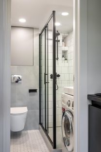 • Современная ванная комната с душевой и стиральной машиной с функцией сушки для вашего комфорта.