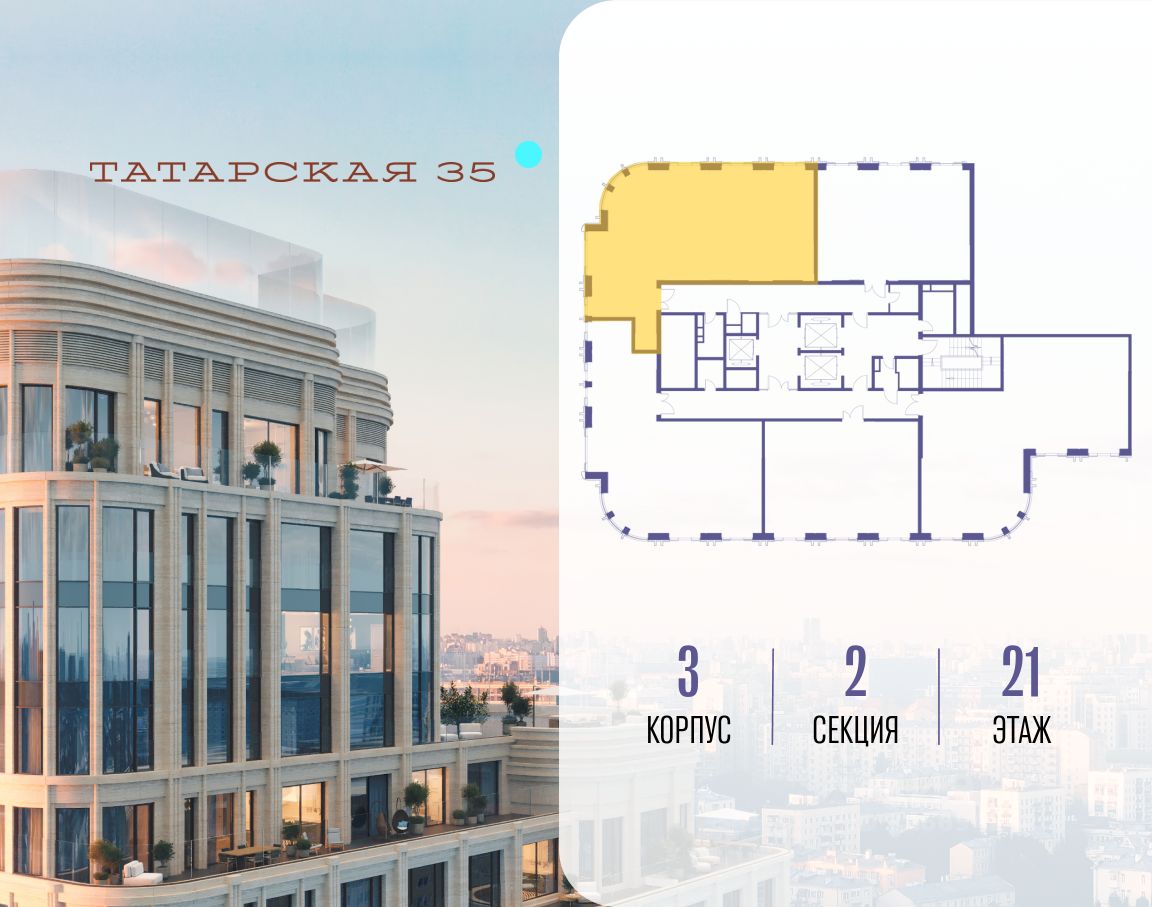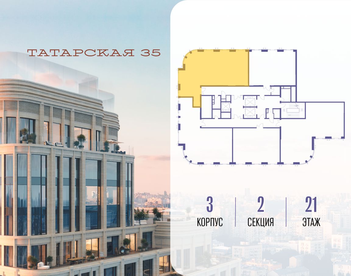 ТАТАРСКАЯ, 35 - новая архитектурная доминанта Замоскворечья, достопримечательность на фотопанорамах исторического центра Москвы. Элитный дом, созданный для тех, кто умеет смотреть далеко вперед, мыслить масштабно и воплощать собственный сценарий жизни.