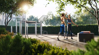 Собственные спорт-румы, детская, репетиторская, бьюти-пространства, деловое пространство с коворкингом, переговорной и сигарной. Собственный трехуровневый фитнесс-центр с бассейном, тренажерным залом, сауной, хаммамом, массажным кабинетом. Площадь двора - 1,8 га, половина территории покрыта деревьями, кустарниками и лужайками.
