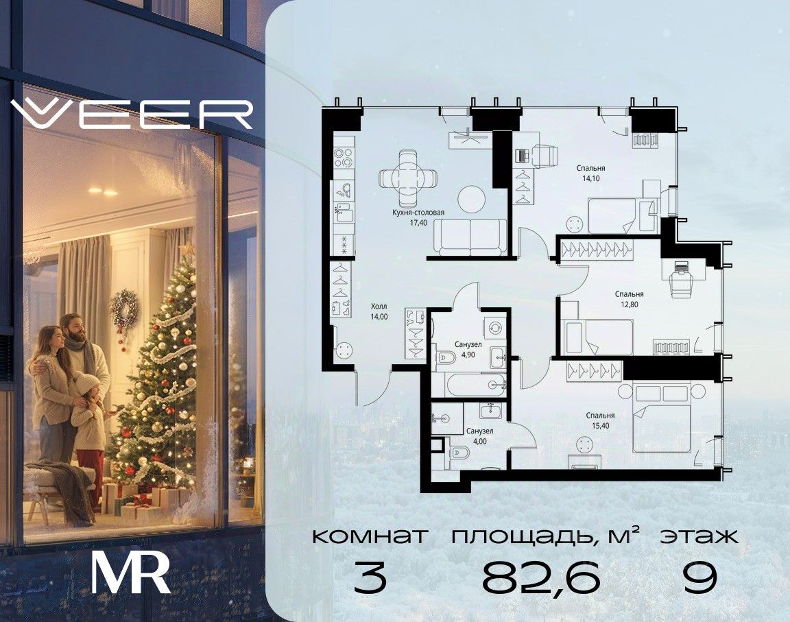Продаётся 3-комнатная квартира общей площадью 82.60 м² с предчистовой отделкой в ЖК VEER на 9-м этаже 59 этажного дома.