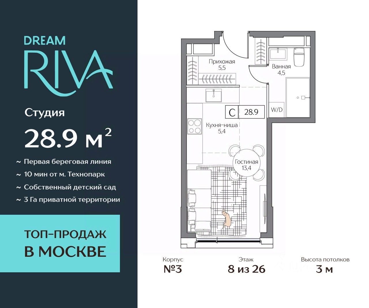 Общая площадь: 28.9 кв.м.