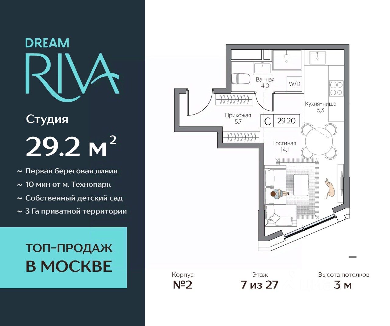 Общая площадь: 29.2 кв.м.