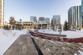 Территория комплекса огорожена и охраняется 24/7. Благоустроенная территория без машин с авторским эксклюзивным ландшафтом, игровые и спортивные площадки, близость реки. На первых этажах расположена коммерческая часть.