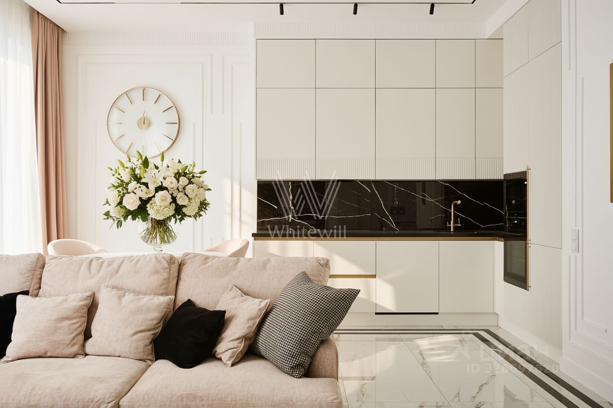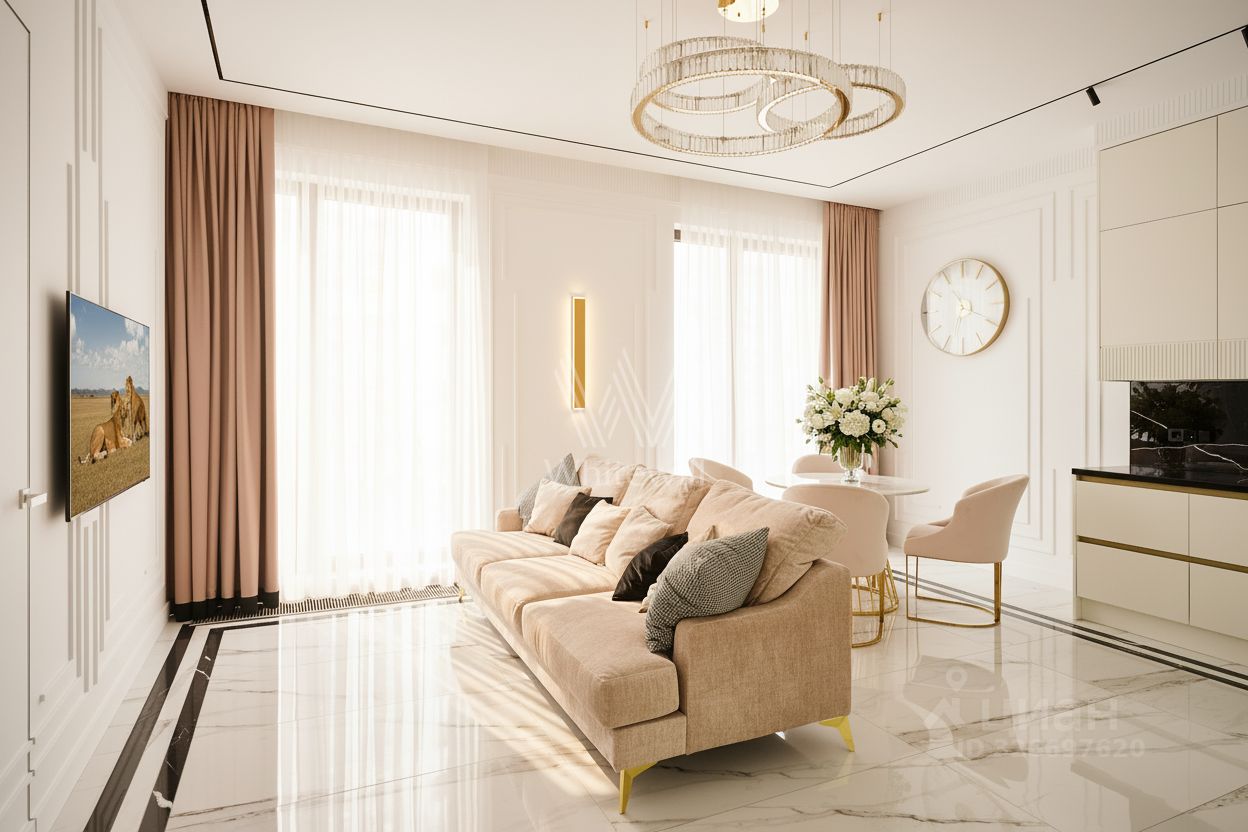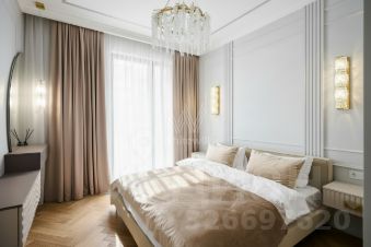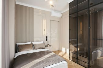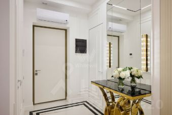 Квартира с дизайнерской отделкой расположена на 12 этаже. Интерьер оформлен в стиле современной классики, стены украшены декоративными молдингами и венчающими карнизами.