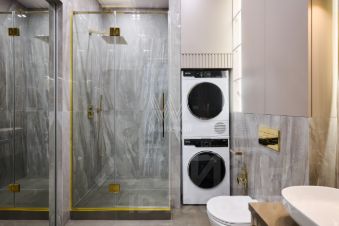 Функциональная планировка включает кухню-гостиную с обеденной зоной, мастер-спальню с собственной гардеробной, санузлом со стиральной и сушильной машинами Korting, вторую спальню, гостевой санузел и холл. Благодаря панорамному остеклению пространство наполнено естественным светом и теплом. Из окон открываются виды на город.