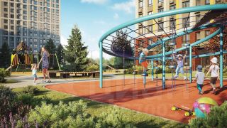 Внутренние пространства организованы по принципу дворы без машин с озеленёнными аллеями, игровыми и спортивными зонами — тихо, безопасно и по-городскому уютно.