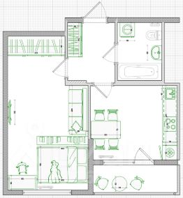 При желании можно сделать лёгкую перепланировку перенеся комнатную дверь. В этом случае в коридоре можно будет создать огромный встроенный шкаф, а в комнате нишу для двухспальной кровати с двумя тумбочками по бокам. Пример планировки и расстановки мебели на фото.