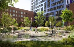 Благоустройство (2,28 га): зоны для работы на воздухе, сезонная речка, летний кинотеатр, озеленение 50% территории.