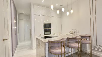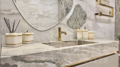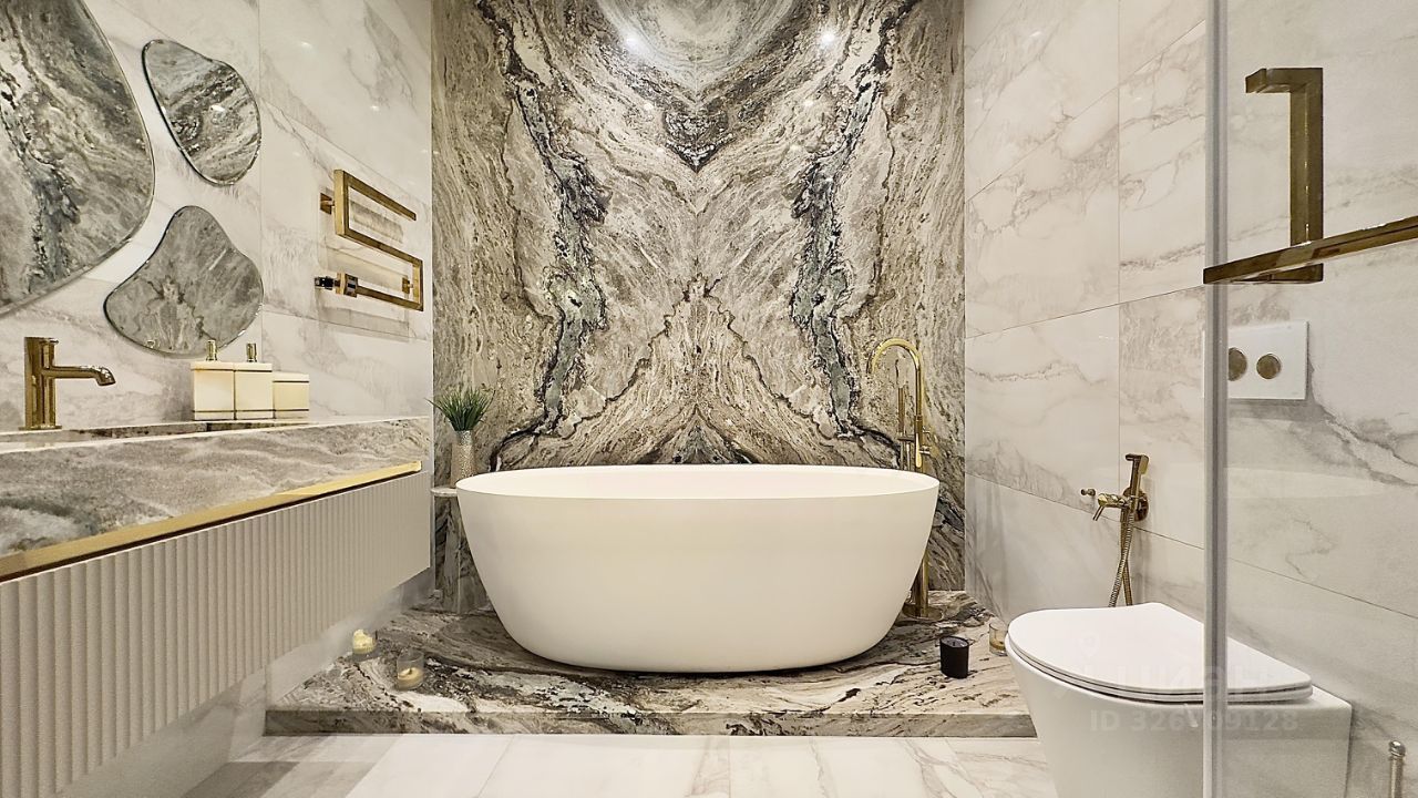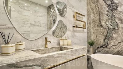 - натуральный камень на кухне, камин, остров и отделка в ванной комнате (кварцит, мрамор)