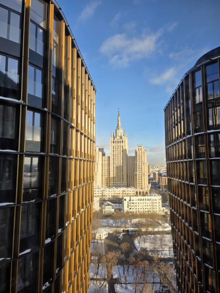 Апартаменты на 17 этаже, 130,5 м², много света и воздуха: широкая линия панорамных окон и действительно сильные виды на город — тот самый центр Москвы, который не надо додумывать.